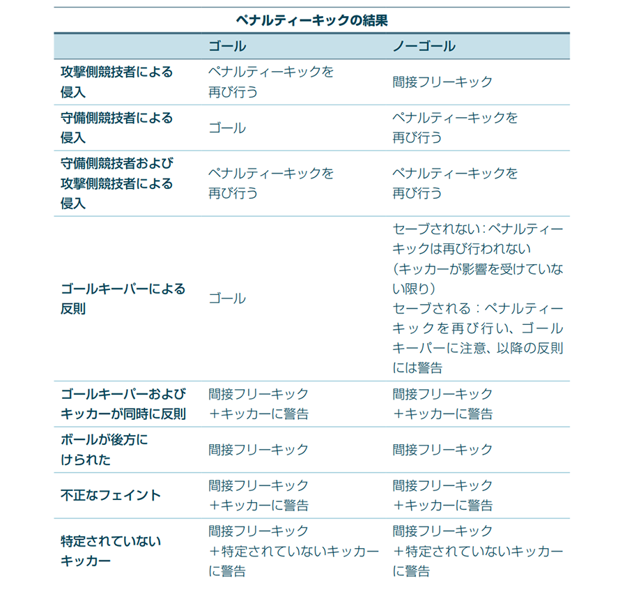 ペナルティーキックは、ボールの動きが止まったとき、アウトオブプレーになったとき、または反則があって主審がプレーを停止したときに完了する。