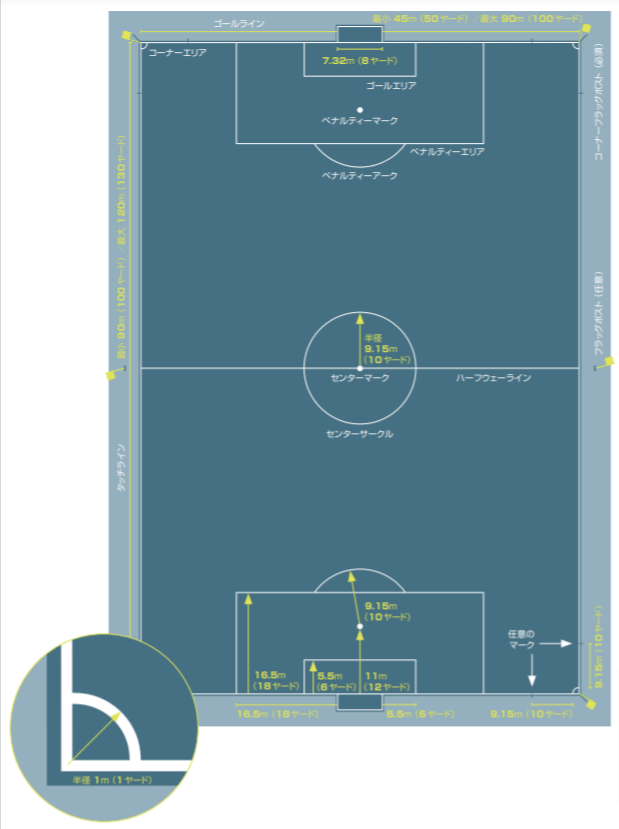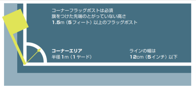 コーナーエリアは、それぞれのコーナーフラッグポストから、半径1m(1ヤード)の四分円を競技のフィールド内に描いて規定される。