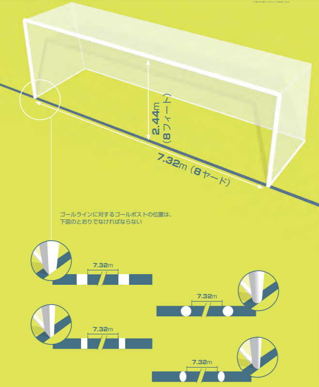 両ポストの間隔(内測)は、7.32m(8ヤード)で、クロスバーの下端からグラウンドまでの距離は、2.44m(8フィート)である。