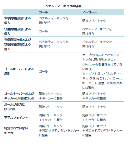 ・ゴールキーパーとキッカーが同時に反則を行った場合、キッカーは警告され、守備側チームの間接フリーキックでプレーを再開する。