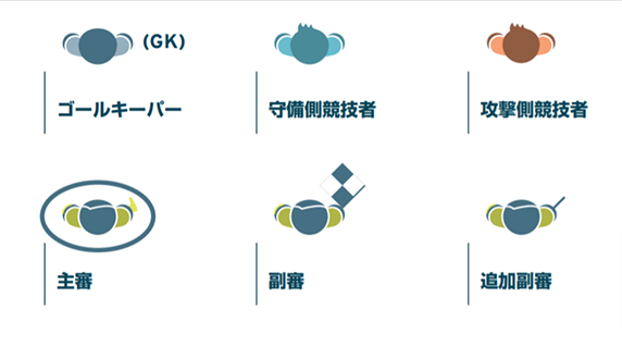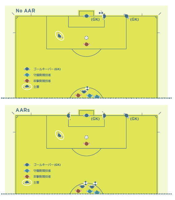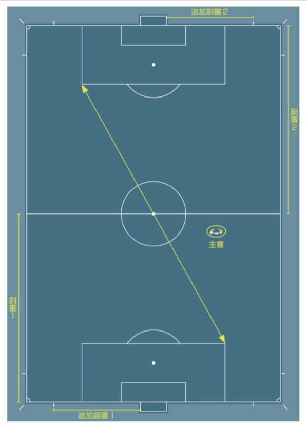 ただし、追加副審がいる場合、追加副審はゴールラインとゴールエリアの交点のところに位置しなければならない。副審は、ペナルティーマークのライン(オフサイドライン)に位置する。
