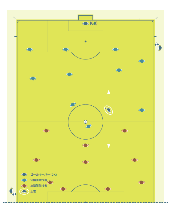副審は、後方から2人目の守備側競技者のラインに位置する。