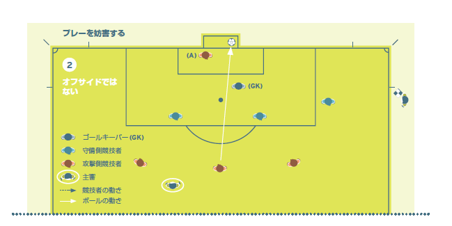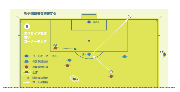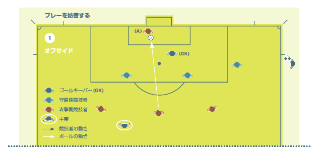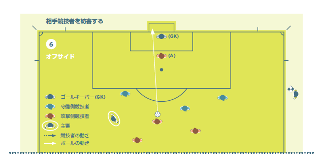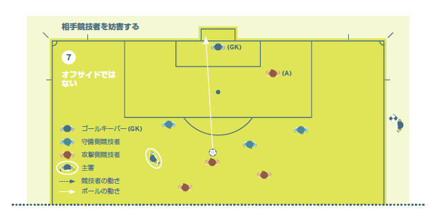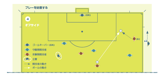 攻撃側競技者(A)がオフサイドポジションにいて、ゴールキーパーの視線を明らかに遮った。競技者は、相手競技者のプレーまたはプレーする可能性を妨げたことで罰せられなければならない。