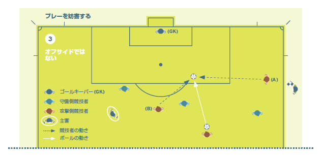 オフサイドポジションにいる攻撃側競技者(A)はボールに向かって走り、ボールに向かうことで相手競技者(B)にチャレンジすることによって、(B)のプレーまたはプレーする可能性を妨げた。(A)は、ボールに向かうことで(B)にチャレンジしている。