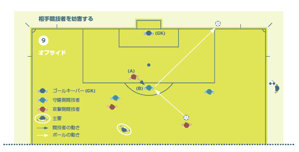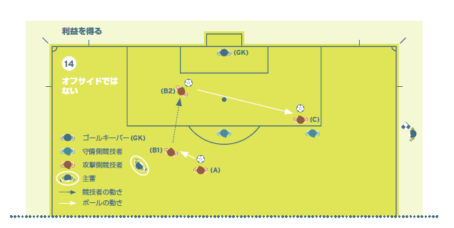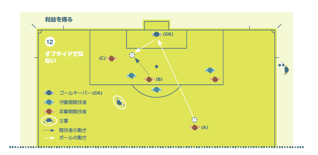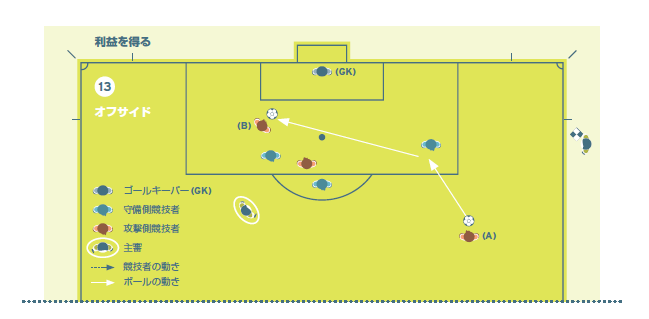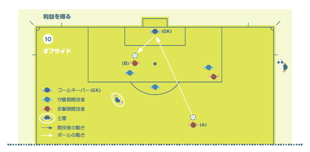 オフサイドポジションにいた攻撃側競技者(A)は、オンサイドポジションにいるその他の味方競技者がボールをプレーする可能性がないと主審が判断した場合、ボールにプレーする、または触れる前に罰せられることがある。解説映像はこちら