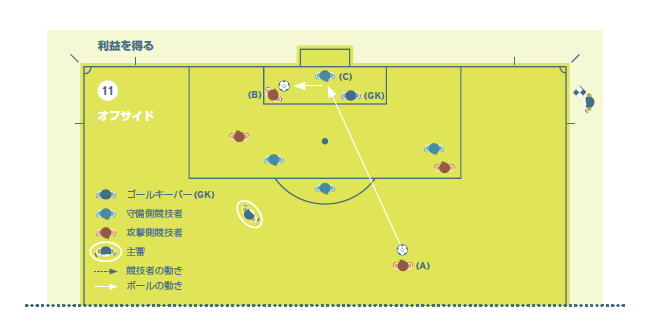 味方競技者(A)がシュートしたボールがゴールキーパーからはね返って、オンサイドポジションにいた競技者(B)がボールをプレーした。競技者(C)はオフサイドポジションにいたが、ボールに触れず、オフサイドポジションにいることによって利益を得ていないので、罰せられない。