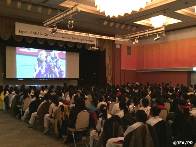 午前中は参加選手全員で、なでしこジャパンが2011年にFIFA女子ワールドカップ ドイツ大会で優勝した時のDVDを鑑賞しました。鑑賞後JFA野田朱美女子委員長から、「優勝を成し遂げた選手たちは、世界一という夢を持ってプレーしてそれを成し遂げた。皆さんも夢を持ってサッカーを続け、将来FIFAワールドカップで活躍してほしい。」と選手へメッセージが送られました。終了後、野田委員長は、選手からなでしこジャパンについて多くの質問を受け、日本チームへの関心の高さが見られました。