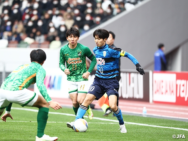 立ち上がりから、主導権を握ったのは、キャプテンの松木玖生選手が「自分たちでモチベーションを高め合いながら、最高のアップができたので、『これは、もう勝ったな』と確信していた」と振り返る青森山田高校(青森)でした。黒田剛監督に「青森山田が1年間志向してきたプレッシングサッカーをとことんやっていこう」と送り出された選手たちは、キックオフと同時に高い位置からのボール奪取を狙いました。