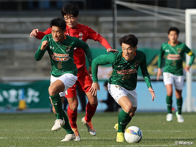 「相手にボールを蹴り込まれて、自分たちの展開に持っていけない場面が多かった」。神村学園高等部(鹿児島)の栢野裕一監督代行がそう振り返った通り、第2試合は青森山田高校(青森)のペースで試合が進みました。16分には、芝田玲選手のクロスボールを小湊絆選手が頭で合わせましたが、シュートは枠の外。34分には右サイド高い位置で小湊選手がボールを奪うと、ドリブルからゴール前に展開。受けた中山竜之介選手がエリア内でのボールキープから振り向きざまにゴールを決めて、青森山田が均衡を崩しました。