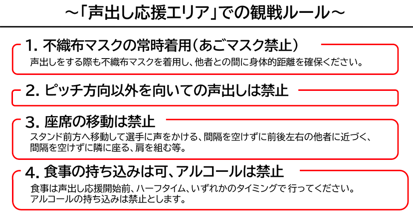 声出し応援適用試合においては、限定された一部のエリアでのみ、声出し応援が可能となります。声出し応援エリアでは、以下観戦ルールを遵守ください。