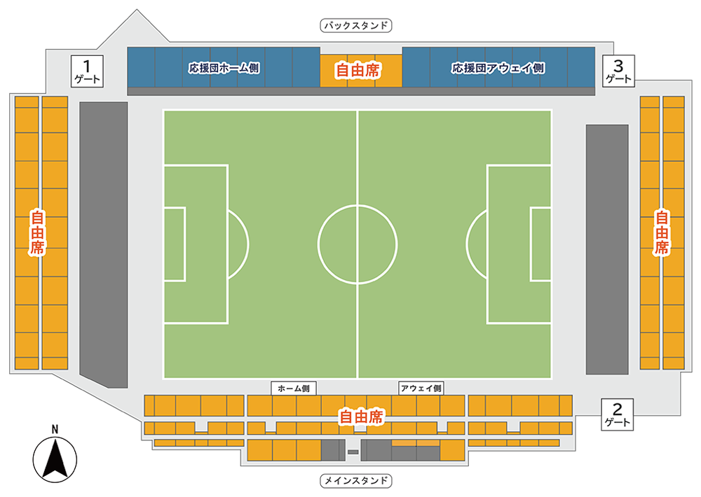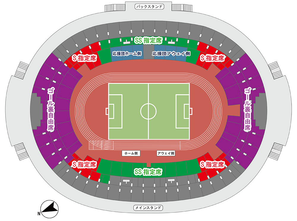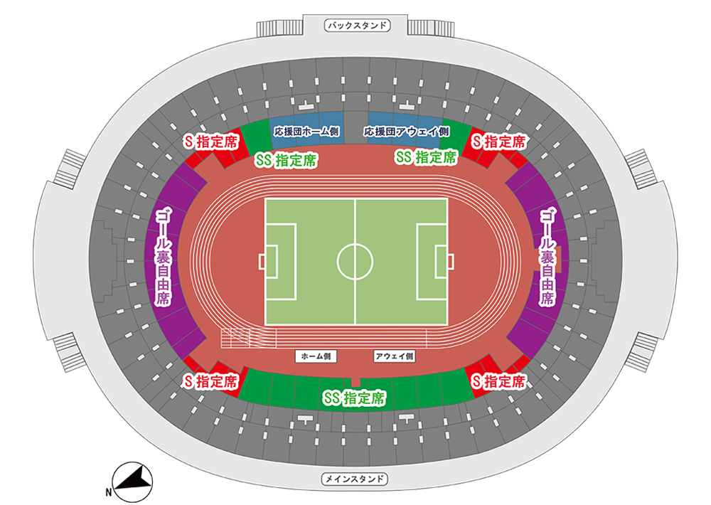 ※ SS指定席は、「北側」「中央」「南側」、S指定席・ゴール裏自由席・車いす席は「北側」「南側」からエリアを選択いただけます。