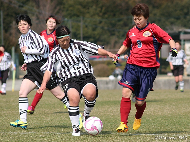 第28回全国レディースサッカー大会は3月19日(日)、時之栖スポーツセンター(静岡県裾野市)で大会第2日が行われました。この日は1次ラウンド最終節と順位別トーナメント1回戦までが行われました。