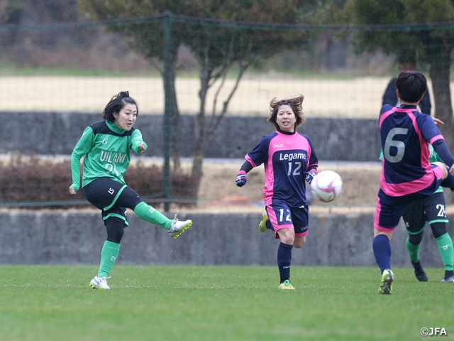 1位トーナメントの決勝を戦ったのは、3連覇を狙うUILANI FC(関東1/埼玉)と、初出場した昨年に無敗ながら2位トーナメントにまわり、優勝で溜飲を下げたLegameでした。ともになでしこリーグでプレーした選手たちを擁するチームの対戦は、緊張も手伝ってか意外な形で動きました。開始早々の2分、UILANIの岩倉三恵選手がミドルシュートを放つと、タイミングと思わぬ軌道に虚を突かれたかGKが動けず、その頭上を抜けて先制点が決まりました。