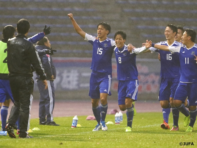 試合は1-1のまま延長戦に突入し、両チームともに積極的に選手を代えて主導権を握ろうとしますが、流れは追いついた関西学院大にありました。97分、小野晃弘選手のフリーキックに、ゴール前の混戦の中で米原祐選手が頭で合わせて関西学院大が逆転に成功します。その後、流通経済大も中村慶太選手が決定的なシュートを放ちますが、関西学院大GKの上田智輝選手がファインセーブでこれを防ぎ、得点を許しません。