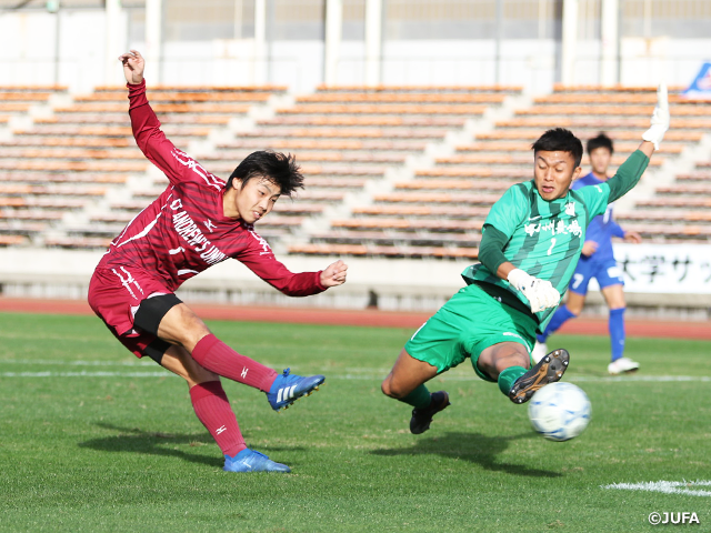 福岡大学と札幌大学の一戦は、福岡大学が30分にPKを獲得。梅田魁人選手がこれを決めて先制すると、52分にも梅田選手がCKから追加点。その後、札幌大学に1点を返されるものの、80分には梅田選手がハットトリックとなるゴールを決めて3-1に。試合はそのまま終了し、福岡大学が2回戦進出を決めました。