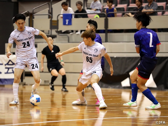 東北大学フットサル部ディーグッチ(東北/宮城)と東京国際大学サッカー部(関東2/埼玉)による3位決定戦は、序盤から東京国際大が高い位置にボールを運んでチャンスをつくりますが、得点には至りません。対する東北大は13分、CKの流れから新井悠斗選手がミドルシュートを放つと、これがゴール左隅に決まり、先制に成功します。