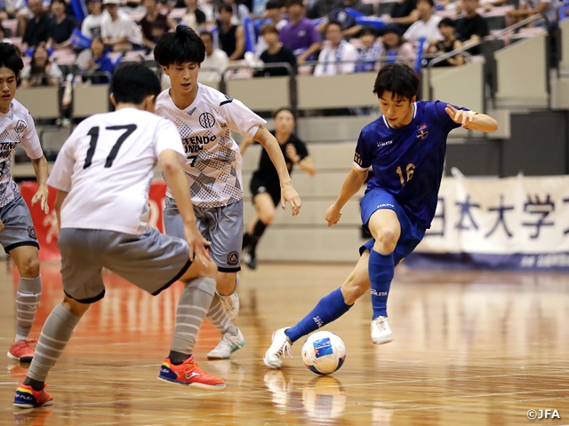 大阪成蹊大学フットサル部(開催地/大阪)と順天堂大学フットサル部ガジル/jfc(関東1/千葉)による決勝は壮絶な戦いになりました。史上初の4連覇を目指す大阪成蹊大はピッチに立つ選手の組み合わせに応じて戦術を変え、順天堂大のゴールに迫ります。しかし第1ピリオド終了間際の19分、それまで劣勢だった順天堂大はカウンターから三浦歩漣選手が先制点を奪いました。