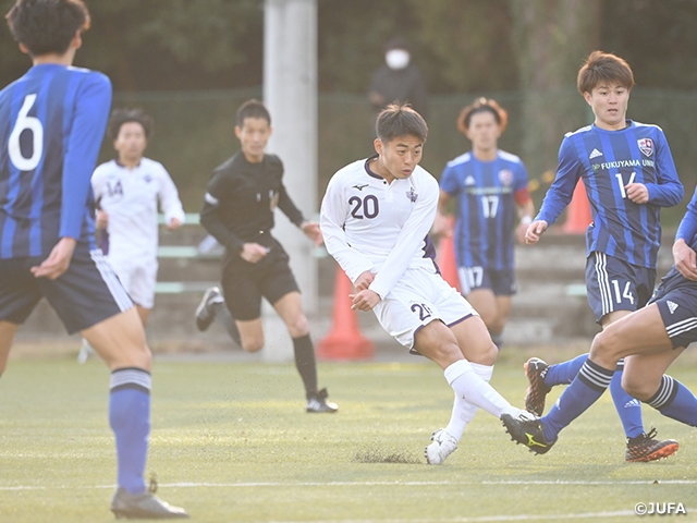 昨年度は総理大臣杯とインカレの両大会で優勝し、全国大会二冠を達成した王者・明治大学。しかし初戦は福山大学(中国1)に苦戦を強いられることとなりました。記録的な強風の中、風下でのスタートとなった明治大学は、なかなか自分たちのリズムを作ることができません。逆に福山大学は、そのすきを突いて10分にCKを獲得。泉勇也選手の蹴り入れたキックは明治大DFがクリアするものの、ボールはそのままゴールへ。福山大学がオウンゴールで先制点を挙げます。福山大学はその後も、風上の優位性を活かして攻撃を仕掛けますが、明治大学の堅固な守備を崩すまでにはいたりませんでした。
