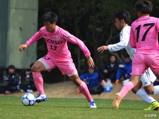 大会初日で2連覇中の全日本大学選抜が敗れ、全4試合がPK戦で決着がつくという波乱含みの幕開けとなった本大会。準決勝では、関東選抜Aが北海道・東北選抜を、関西選抜が九州選抜をそれぞれ大差で下し、関東選抜Aが9年ぶり、関西選抜は2年ぶりに決勝戦進出をはたしました。
