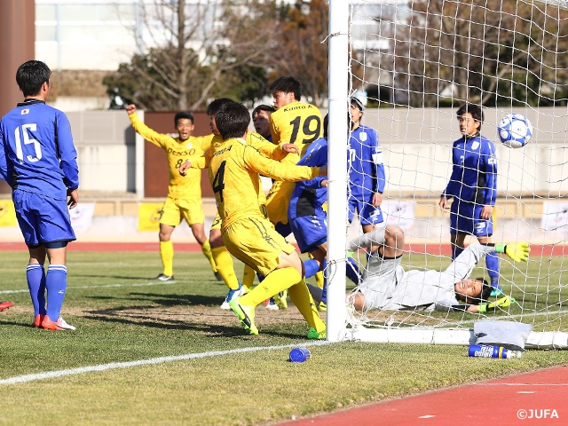 試合は振り出しに戻り、後半に突入。両チーム一進一退の攻防を繰り広げますが、ともに追加点を挙げることはできません。90分が過ぎ、試合はアディショナルタイムに突入。延長戦を行わない規定のため、このままPK戦に突入かと思われた90+3分に、ついに試合が動きます。関東選抜Aはコーナーキックを獲得。西澤健太選手(筑波大学)のキックしたボールを、体ごとゴールへ押し込んだのは、71分にピッチに送り出された鈴木国友選手(桐蔭横浜大学)でした。終了間際の、鈴木選手の今大会初ゴールが決勝点となり、関東選抜Aが劇的な勝利で10年ぶりの優勝を果たしました。