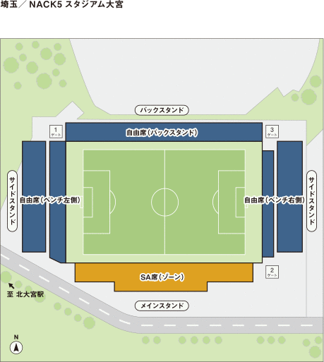 JR「大宮」駅東口より、国際興業バス「導守循環」行きで「大宮サッカー場前」下車徒歩約1分