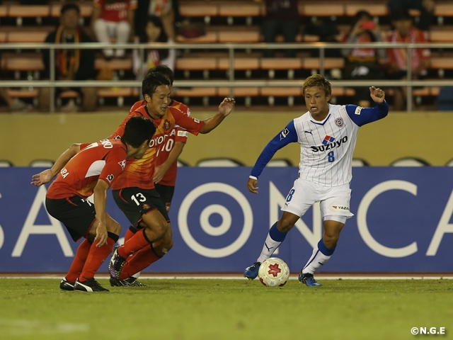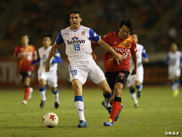 名古屋はSAMURAI BLUE(日本代表)に帯同中の田口泰士選手、清水もスロベニア代表に選ばれたノヴァコヴィッチ選手が不在と、共に攻撃の要を欠いたこの一戦。先に主導権を握ったのは清水でした。中盤でのボール回しからサイドに展開してチャンスを広げると、14分に右サイドを突破した六平光成選手の折り返しを大前元紀選手がフリーでシュート。続く15分には後方からのフィードに反応した高木俊幸選手がフィニッシュに持ち込むものの、共にゴールの枠をとらえることができません。対する名古屋は20分、松田力選手が低いボールに反応し、倒れながらゴールに流し込みましたが、判定はオフサイド。前半は0-0で終了します。