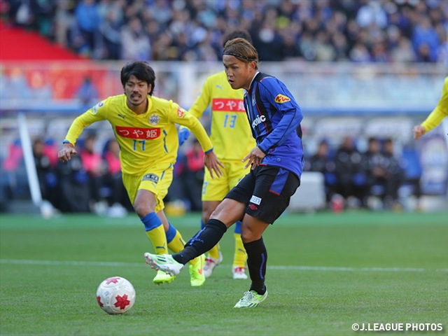 しかし、先制したのはガンバ大阪でした。前半4分、FKからのロングボールをFWパトリック選手が頭でつないで、走り込んだ宇佐美選手がシュート。これは相手GK山岸範宏選手に弾かれましたが、そのままゴール前に詰めた宇佐美選手がリバウンドに鋭く反応して右足で押し込みました。