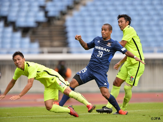 大雨により後半途中に中断・中止された第95回天皇杯全日本サッカー選手権大会2回戦 横浜F・マリノス対MIOびわこ滋賀の再開試合が11日、ニッパツ三ツ沢球技場から日産スタジアムに戦いの場を移して行われました。