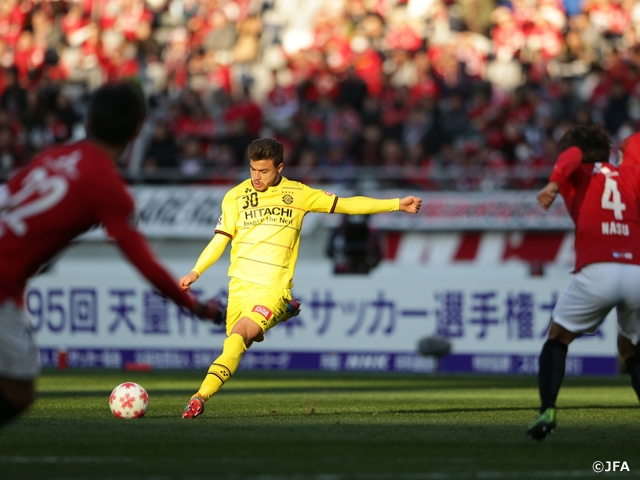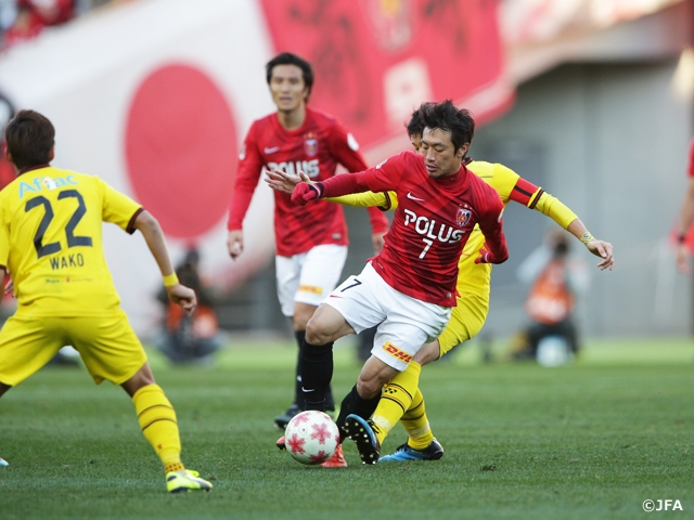 連覇した第86回(2006年)大会以来となる4強入りの浦和は、開始早々、右サイドの関根貴大選手のクロスにゴール前に走り込んだMF武藤雄樹選手が右足を合わせて相手ゴールを脅かします。その後も、サイドからチャンスを作り、22分にはMF阿部勇樹選手がCKの流れからシュートを狙いますが、枠を捉えることは出来ません。