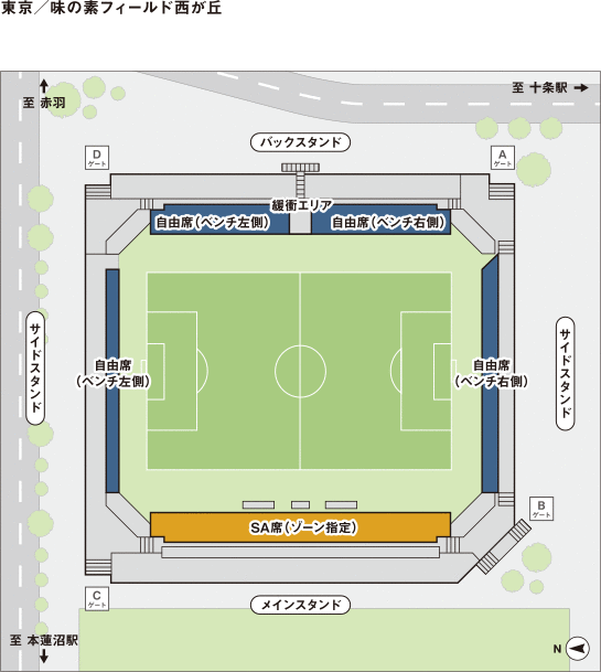 ■JR埼京線「十条」駅より、国際興業バス「赤羽駅西口」行きで「国立西が丘競技場」下車、徒歩約3分