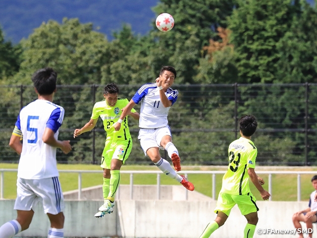 あとがなくなった滋賀はその3分後、セットプレーのチャンスに大杉誠人選手がヘディングで合わせて、1点を返しました。このゴールで試合の流れが滋賀に傾くかと思われましたが、関西学院大は気落ちすることなく、果敢に攻め込んでいきます。失点した直後の62分、魚里直哉選手の鮮やかなミドルシュートを決めて再び相手を突き離し、3-1で試合を終えました。好スタートを切った関西学院大は、9月3日(土)の2回戦でアルビレックス新潟(J1)と対戦します。