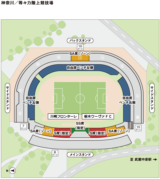 ■東急・JR「武蔵小杉」駅北口より、バス「溝の口方面」行きで「市営等々力グランド入口」下車、徒歩約5分