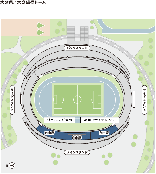 ■JR「大分」駅前3番乗り場より、バス「パークプレイス大分」行きで「大分スポーツ公園東」下車