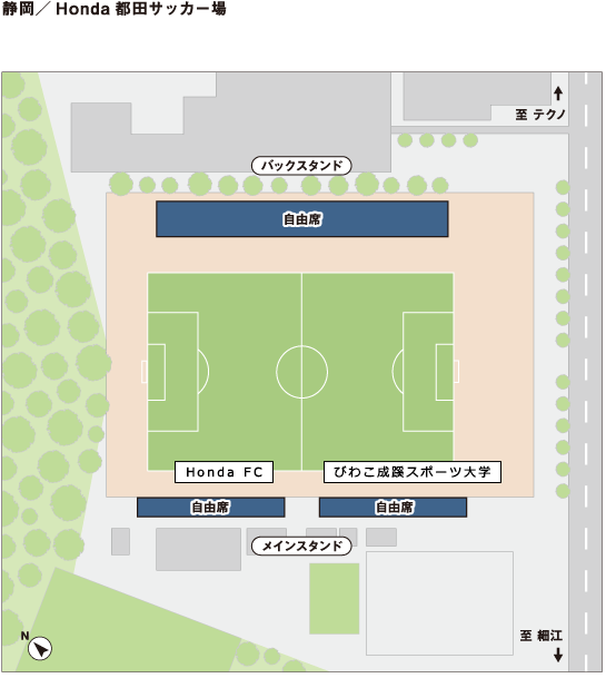 ■JR「浜松」駅バスターミナル16番乗り場より都田線(46 市役所 葵町 都田口 テクノ方面)に乗車し、「本田サッカー場」下車(乗車時間役40分)、徒歩約1分