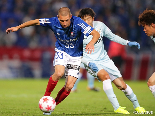 対する横浜FMは、まずは守りを安定させて、速い攻撃を狙います。1トップに入った富樫敬真選手が左右のスペースに流れ、前田直輝選手もトップ下から飛び出すなどして、ボールを引き出すことを狙いました。また、右サイドで存在感を見せていたのが遠藤渓太選手。タッチライン際で飛び出してボールを呼び込めば果敢に個人で仕掛け、さらには中央にも入って積極的にプレーに関わろうとし、こぼれ球を拾ってFKを奪う場面も目立ちました。