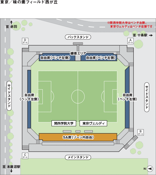 ■JR埼京線「十条」駅より、国際興業バス「赤羽駅西口」行きで「国立西が丘競技場」下車、徒歩約3分