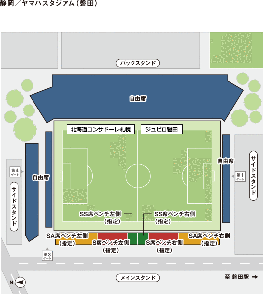 自由席(バックスタンドおよび南側スタンド)での観戦は、北海道コンサドーレ札幌の応援グッズを身に着けてのご観戦は禁止となっております。