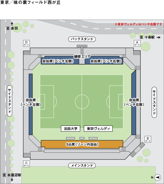 ■JR埼京線「十条」駅より、国際興業バス「赤羽駅西口」行きで「国立西が丘競技場」下車、徒歩約3分
