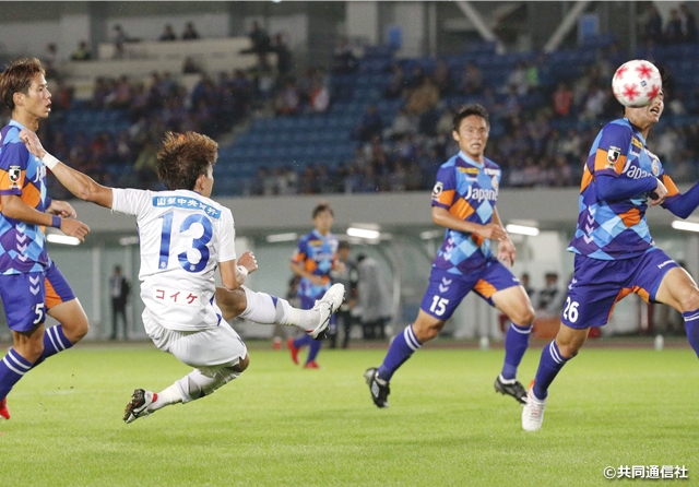 立ち上がりからテンポの良い連携で前線にボールを運び、積極的にゴールを狙った長崎。前半9分、畑潤基選手が敵陣内でボールを奪うと、パスを受けた吉岡雅和選手が左足でのミドルシュートで先制しました。さらに同14分の左コーナーキックでは、仲間が空けたスペースに走り込んだ新里涼選手が左足で鮮やかなボレーを蹴り込み、2点目を挙げました。一方の甲府は同31分、右コーナーキックからゴール近くでボールを受けた太田修介選手が振り向きざまに放ったシュートでネットを揺らし、1点差で前半を折り返しました。