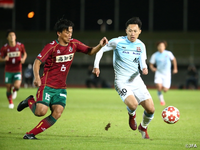 追い掛ける展開となった高知も反撃に転じ、45+1分にはDF平田拳一朗選手が左サイドからクロス。ファーサイドのFW赤星魁麻選手が頭で落としたボールを、FW田口遼選手が押し込みました。西村昭宏監督が、「勇気を与えてくれたゴール」と評する一撃で追いついた高知は、後半に入るとMF青木捷選手を投入し、1ボランチから2ボランチへとシステムを変更。狙いについて、西村監督は「トーナメントは勝つことが全て。最後に1点でも多く、リードが奪えている状況をつくるため、まずは守備から入った」と明かします。