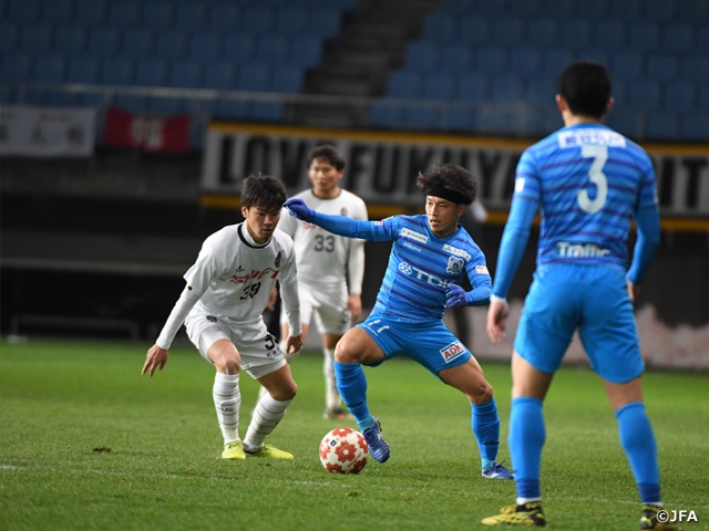 同点のまま折り返すかに思われた前半終了間際、勝ち越し点を奪ったのは久富賢選手。右CKから流れてきたボールを遠いサイドで体勢を崩しながら右足で決め「ボールがこぼれてこいと、あの位置にいた」と胸を張りました。
