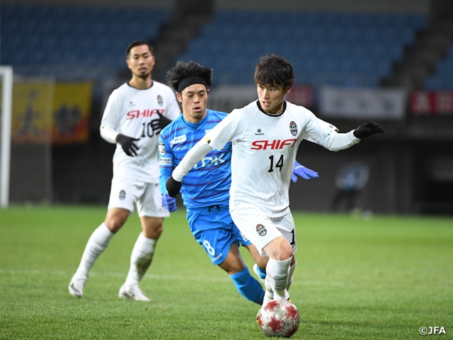 後半も守勢に回りましたが、ここで踏ん張ったのがJ3で今季最少失点を記録した守備陣でした。センターバックの千田海人選手を中心にゴールを割らせずに耐えると、44分に江口直生選手が直接FKを沈め、勝負を決めました。