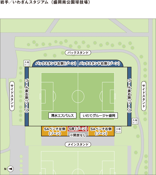 ※盛岡南公園敷地内に新野球場が整備されることから、お車で当球技場へ利用・観戦にお越しになる方は西側駐車場をご利用ください。また台数に限りがございますので、大規模な大会・イベント等でお越しの際は、乗り合いまたは公共交通機関をご利用ください。