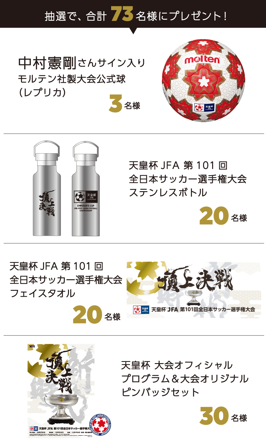 期間中、本キャンペーンに応募した方の中から抽選で、中村憲剛さんサイン入りモルテン社製大会公式球(レプリカ)や第101回大会オリジナルのステンレスボトルなどをプレゼントします。