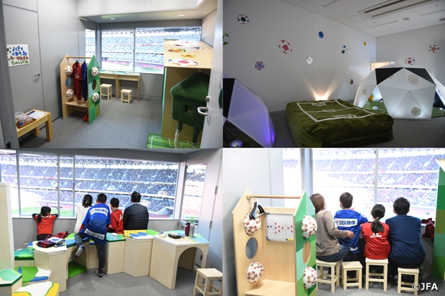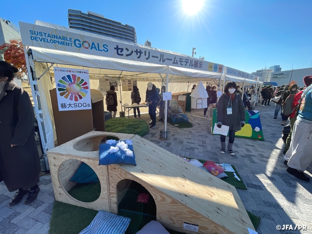 大きな音やまぶしい光が苦手な感覚過敏の症状等を持つお子さまとそのご家族、2家族を招待しました。今回は、「障がいのある方々の困難な体験環境をアートで解決するセンサリールームプロジェクト」として、JFAが協定を結ぶ東京藝術大学の学生や受講生が、日比野克彦教授(JFA理事)の指導のもと新しいカタチのセンサリールームをデザインしました。参加した子どもたちは、時おり、色とりどりのアイテムで遊びながら、楽しく試合を観戦しました。また、このセンサリールームや発達障がいについて広く知っていただくため、来場者も体験できるモデルルームを場外に設けました。