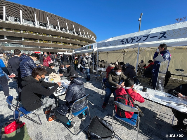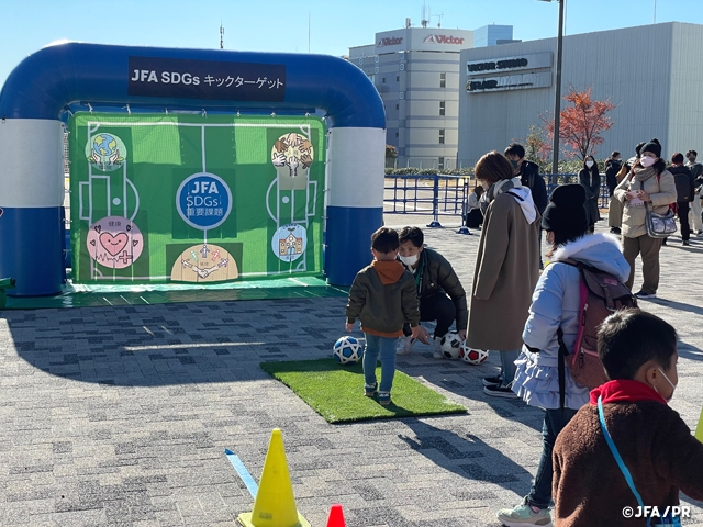 JYDパートナーのモルテン社の協力のもと、すべての子どもたちの成長のきっかけに貢献する組み立て式ボール「MY FOOTBALL KIT」を使ったエコキックターゲットや、MY FOOTBALL KITを実際に触って体験できるブースを出展しました。当日は、視力障がいや発達障がい等を抱える方々とそのご家族など20名が参加し、SDGsチームメンバーの播戸竜二さんと一緒にMY FOOTBALL KITの組み立て体験を楽しみました。