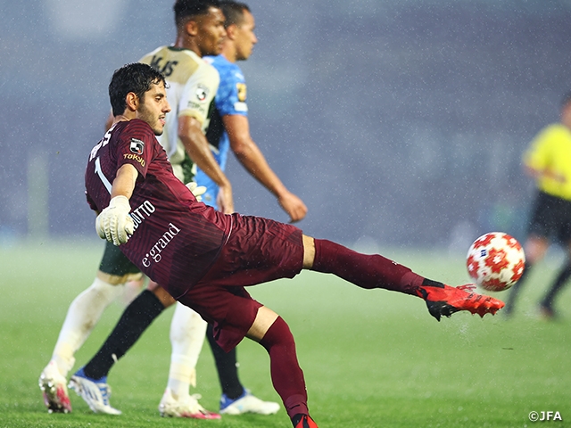 等々力陸上競技場では、川崎フロンターレ(J1)と東京ヴェルディ(J2)が対戦しました。昨季のJ1王者に挑む格好の東京Vは、試合開始からパワー全開でした。前線から果敢にプレスを掛け、相手の隙も逃しません。開始3分には高い位置でボールを奪った佐藤凌我選手が、ドリブルで突進。ファーサイドへ送ったクロスボールにバスケス・バイロン選手が詰めますが、ここは川崎FのGKチョン・ソンリョン選手が体を張ってセーブしました。