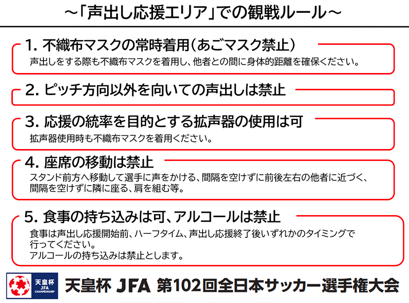 第102回天皇杯は、JFA試合運営管理規定に加えて、新型コロナウイルス感染症対策として「JFA サッカー活動の再開に向けたガイドライン」に基づいての試合開催となります。ご来場にあたり、以下に記載します「来場に際してのご案内」と「スタジアムにおける禁止事項」を遵守いただきますようお願いします。感染拡大防止には、サポーターの皆さまのご理解とご協力が必要となります。