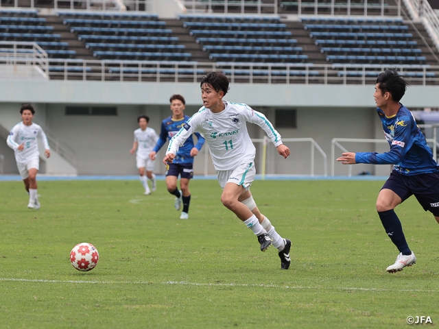 序盤は相手の勢いに飲まれた環太平洋大も、時間の経過とともに山並仁貴選手らを中心にテンポよくボールを動かす場面が増えていきます。25分、後方でのパス回しから井上碧斗選手が相手DFの背後にロングフィードを送ると、ゴール前に抜け出した大野公瑛選手が冷静にシュートを決めて、均衡を崩しました。