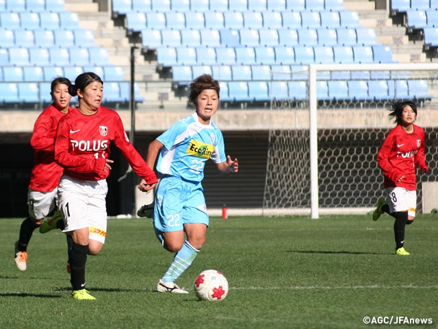 ユアテックスタジアム仙台(宮城)での第1試合は、浦和レッズレディースユース(関東4/埼玉)とASハリマアルビオン(関西3/兵庫)が拮抗した試合を繰り広げます。浦和は要所でドリブルなどの個人技を繰り出し、相手ゴールに迫ります。前半はゴールポストを叩くシュートも放つものの、ASハリマアルビオン(関西3/兵庫)の粘り強い守備の前にゴールを割ることができません。後半も果敢に攻める浦和LYは、80分過ぎから立て続けにチャンスをつくりますが、アディショナルタイムのシュートもゴールポストに嫌われるなど得点することはできず。対するASハリマは、劣勢に陥りながらも水際でピンチを防ぎ、試合は0-0のまま延長戦に突入します。